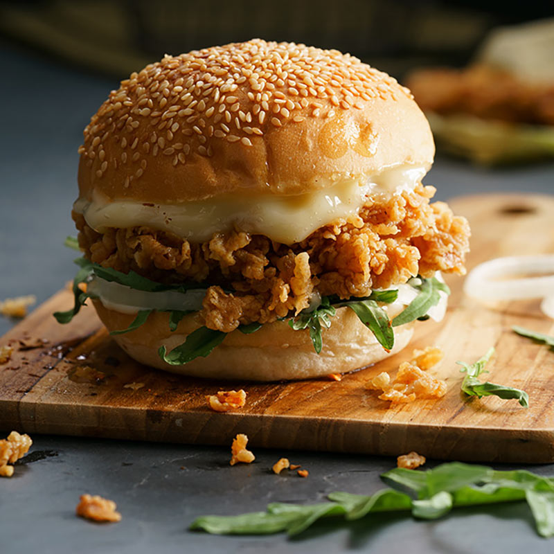 Chicken schnitzel, lettuce, tomato, American cheddar, garlic aioli.