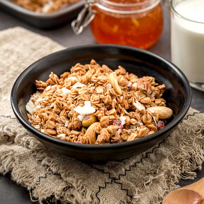 Roasted rolled oats, almonds, shredded coconut, pepitas, served with fresh sweet yogurt and mixed berry compote.
