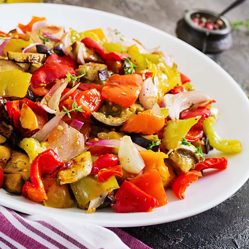 Roasted vegetables with pine nuts.