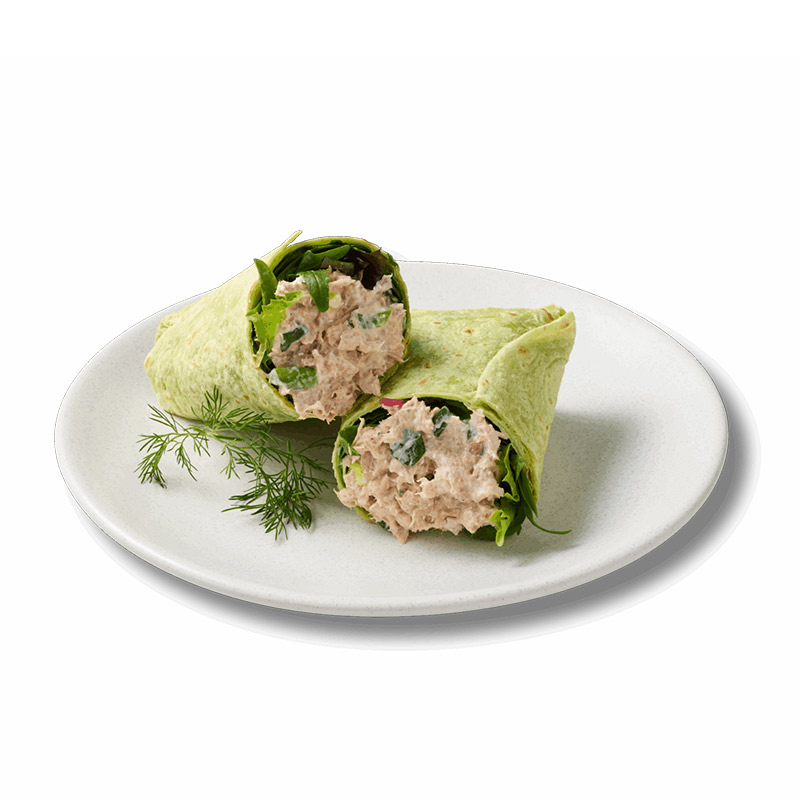 Tortilla bread with rocket, tuna mix (tuna, aioli, Spanish onion, lemon, salt, pepper), tomato, olives.